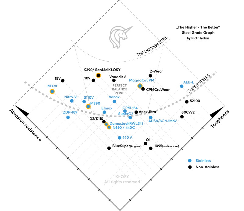 Powyżej granicy możliwości stali konwencjonalnych mamy tzw. 'Super-steels' ( przerywana granica na wykresie) - czyste, wysokostopowe stale o rewelacyjnych właściwościach. Te 'super' cechy uzyskuje się najczęściej w tzw. technologii proszków (PM alb RSP), która pozwala na zwiększenie ilości dodatków stopowych w składzie stali bez wystąpienia problemów, które ograniczają stale konwencjonalne. Takimi właśnie Supersteels są m.in. MagnaCut, M390 czy K390 - gatunek używany w naszych laminatach SanMaiKŁOSY. Narzędziowe stale proszkowe stanowią w tej chwili grupę najdoskonalszych materiałów wykorzystywanych do wyrobu ostrzy.